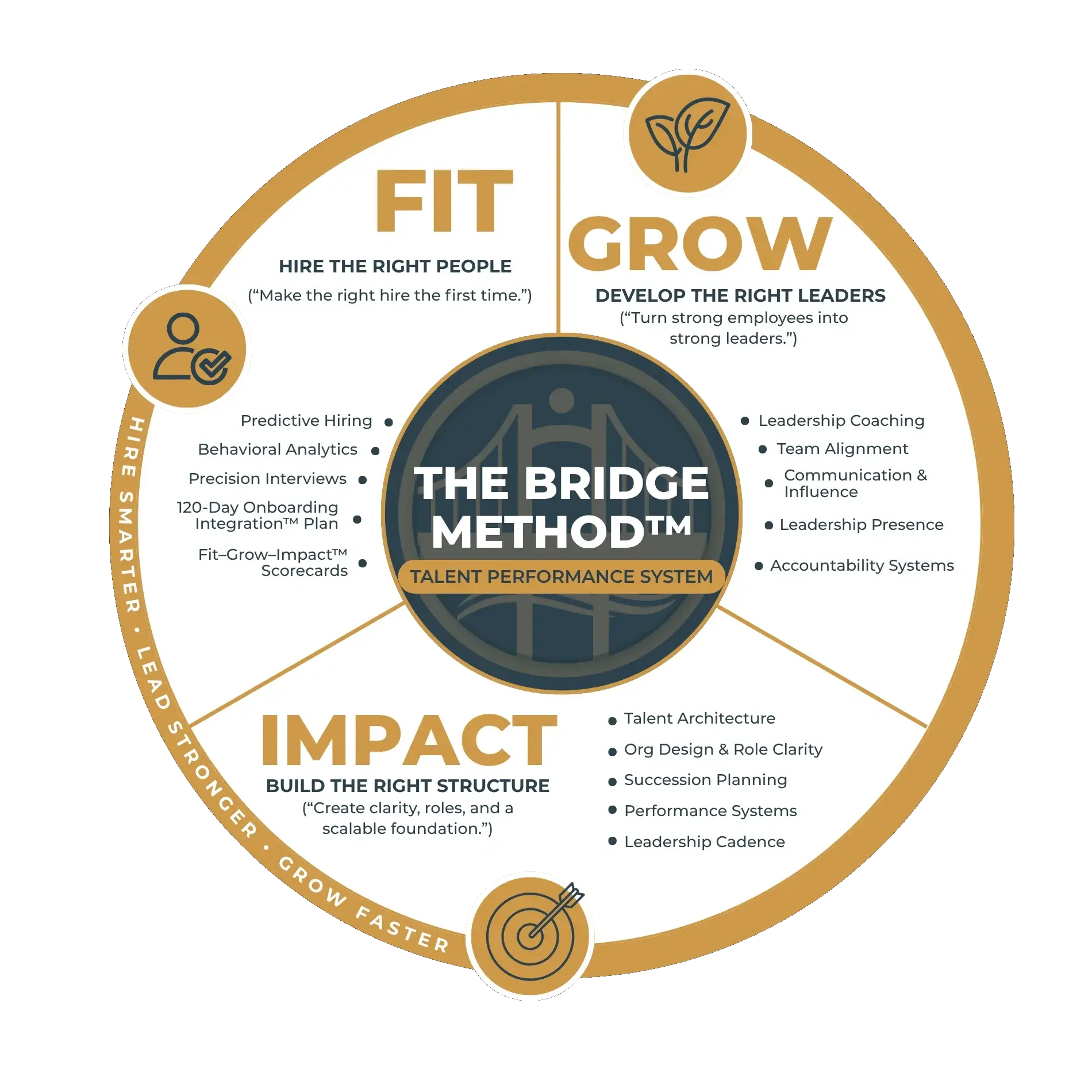 This is our signature end-to-end engagement. We install the FIT, GROW, and IMPACT tracks inside your organization so hiring, leadership, and performance operate as one unified system.